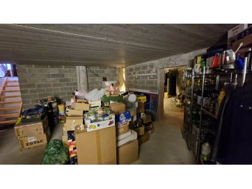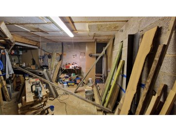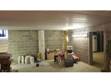 Esimesel korrusel valmis ehitatud avatud planeeringuga trepihall koos avatud köögiga, WC/duširuum, elutuba (mis on plaani peal märgitud garaažina) ja trepiruum, kus on ajutine trepp. Keldrikorrus on väljaehitatud, kuid siseviimistlus puudub.