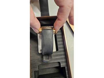 Musta kummist rihmaga käekell ROMAIN JEROME artikkel T.ALG.OXY3R.22BB.00.B2CB Titanic-DNA Le Grande rusted steel/gold koos papist karbi, metallist karbi ja plastik USB kaardiga. Kellarihmal ja korpusel on rohkelt kandmise jälgi.