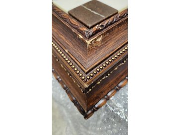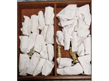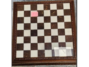 Kivist ja puidust malelaud dekoratsioonidega ning hõbedase ja kuldse värviga nuppudega.